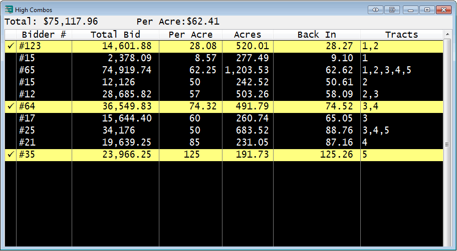 he grid presenter can be set to display the Leaderboard, High Combos with leaders first, High Combos in parcel order (pictured), High Combos Not on the Leaderboard, or the Complete Bid History. To understand just how flexible the Grid Presenter truly is, the following scenarios are possible: